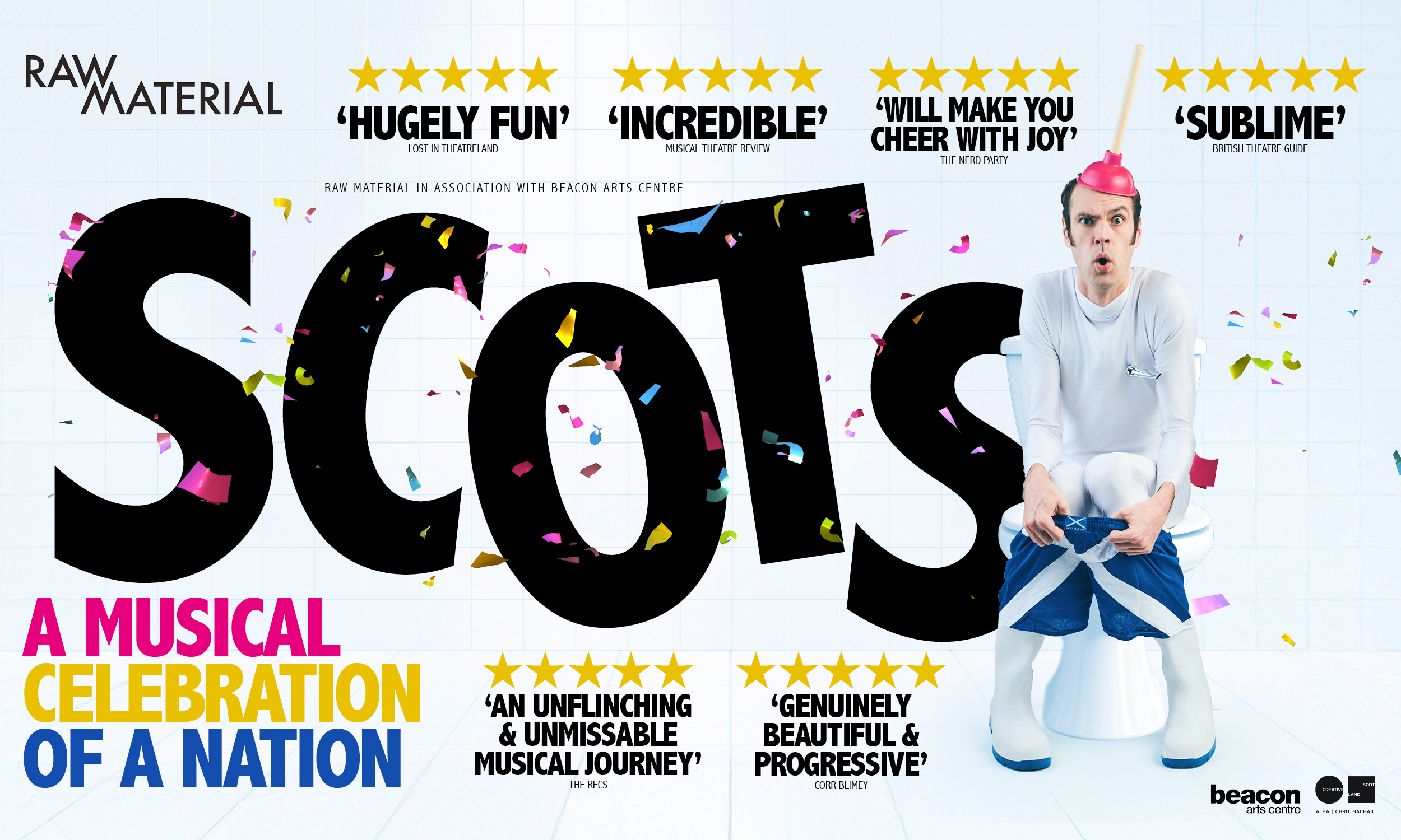 Raw Material in association with Beacon Arts, present ‘SCOTS – The Musical’ by Scott Gilmour & Claire McKenzie, Directed by Jemima Levick and Designed by Kenny Miller. The musical history lesson no-one asked for but everyone needs! SCOTS is the story of Scotland. Its past, present and future. Its people and places, triumphs and failures. All told by a figure who has seen it all… Someone who witnessed the Picts and the Celts unite; who survived the battles of Stirling and Bannockburn; who heard the declaration of Arbroath; who witnessed Scottish Enlightenment, the Industrial Revolution, the charge for women’s rights, the battle for gay rights, the call for Independence – basically someone who’s seen some amount of s**t – Scotland’s greatest invention … The Toilet!